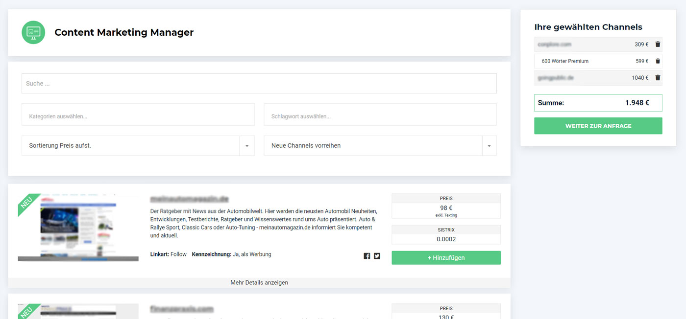 - Auswahl der passenden Publisher: Über den Content Marketing Manager von AdSimple können unsere Kunden aus einer breiten Palette von über 1000 Blogs und Websites in verschiedenen Branchen auswählen. Dies ermöglicht eine gezielte Platzierung von Content auf Seiten, die eine hohe Relevanz für das jeweilige Unternehmen bieten. Damit kaufen Sie dann auch indirekt einen wertvollen Backlink.