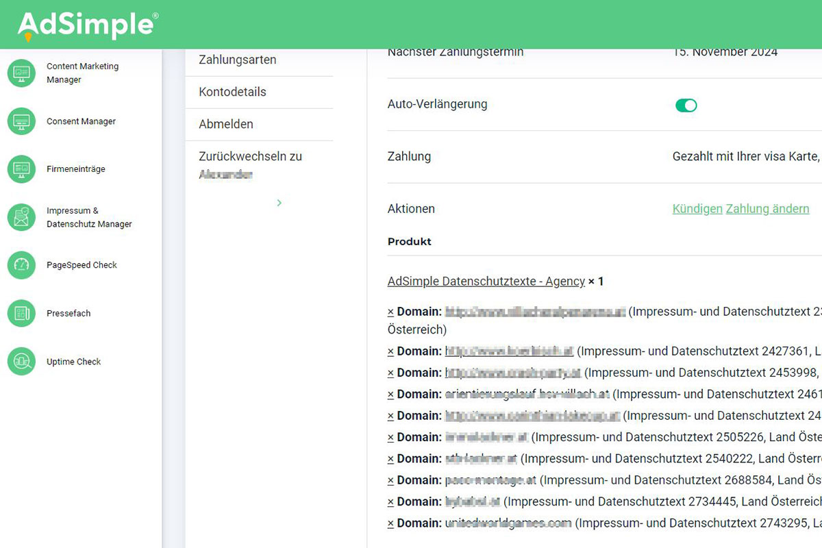 Wenn Sie sich auf adsimple.at mit Ihrem Benutzernamen und Ihrem Passwort anmelden, haben Sie danach Zugang zum AdSimple Dashboard. Dort sehen Sie all unserer AdSimple-Tools.