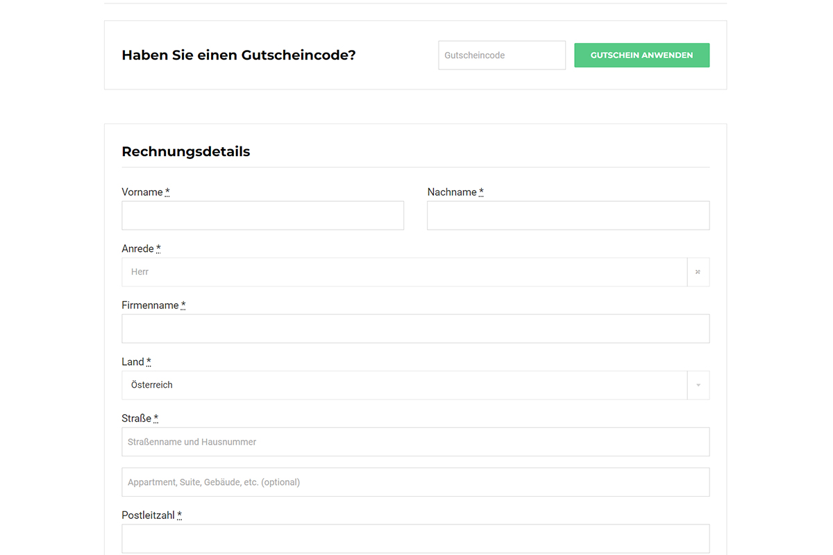Füllen Sie nun das Formular mit Ihren Rechnungsdaten aus. Wenn Sie einen Gutscheincode haben, können Sie diesen oben an der vorgesehenen Stelle eintragen, um den Rabatt zu erhalten.