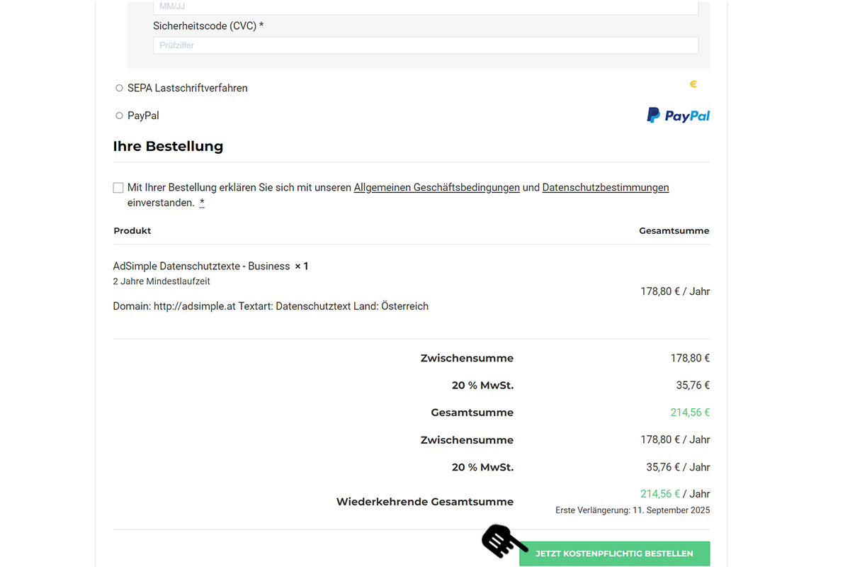 Im nächsten Schritt wählen Sie Ihre bevorzugte Zahlungsart aus. Um den Kauf abzuschließen, müssen Sie unsere AGBs sowie die Datenschutzbestimmungen akzeptieren. Setzen Sie dazu das Häkchen in der entsprechenden Checkbox. Klicken Sie abschließend auf den grünen Button Jetzt kostenpflichtig bestellen, um Ihren Kauf zu bestätigen.