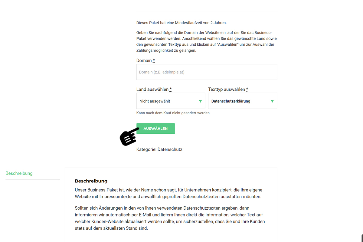 Wenn Sie beispielsweise ein AdSimple Datenschutztexte kaufen möchten, tragen Sie in der Eingabemaske den Namen Ihrer Domain ein. Bestätigen Sie anschließend, dass Sie der Besitzer dieser Domain sind, wählen Sie das Land aus, in dem die Website gehostet wird, und entscheiden Sie sich für den gewünschten Texttyp. Klicken Sie auf den Button Auswählen, um das Produkt in den Bestellprozess zu übernehmen.