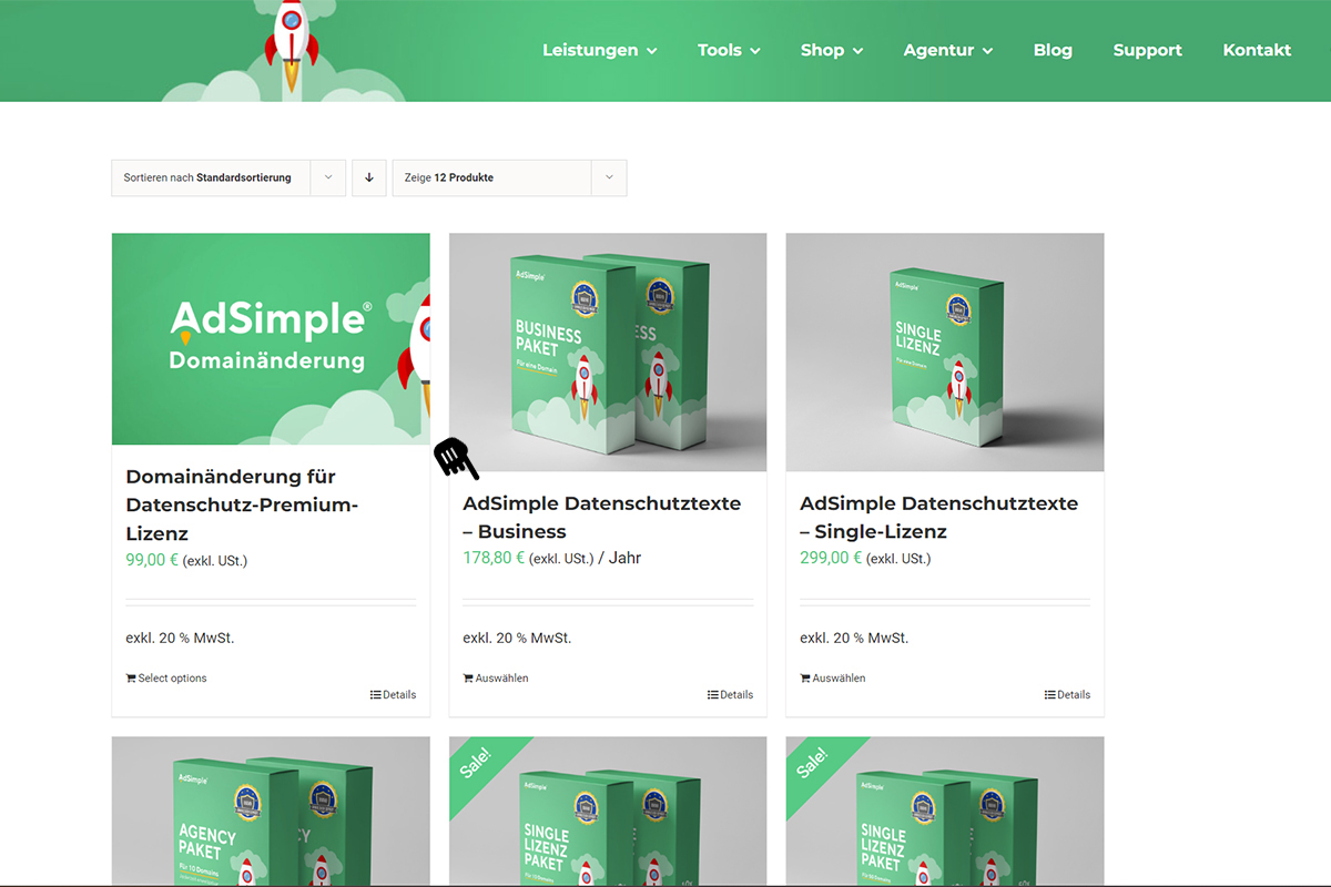 Sie befinden sich nun im AdSimple Onlineshop und sehen die Auswahl unserer Produkte. Hier können Sie verschiedene Produkte einsehen und auswählen. Klicken Sie auf das Produkt, das Sie interessiert, um weitere Informationen zu erhalten. Sie gelangen zu einer detaillierten Produktbeschreibung.
