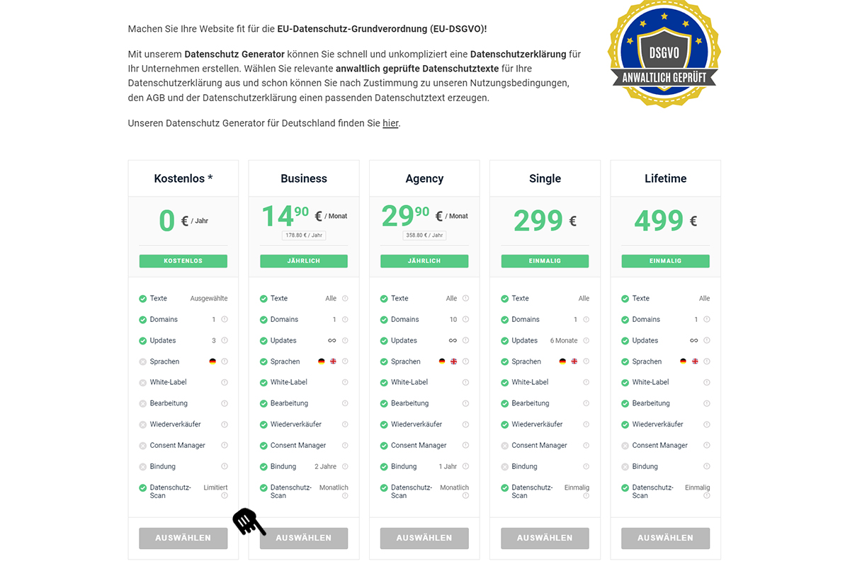 Wenn Sie über den Impressum Generator eine Lizenz für unseren Datenschutz Generator erwerben wollen, scrollen Sie unter die Auswahl der Rechtsformen. Sollten Sie bereits ein Impressum erstellt haben, scollen Sie auch nach unten, bis Sie die Tabelle mit den Lizenzmodellen sehen. Wählen Sie Ihr bevorzugtes Lizenzmodell (z. B. Business-Lizenz) und klicken Sie auf “Auswählen”