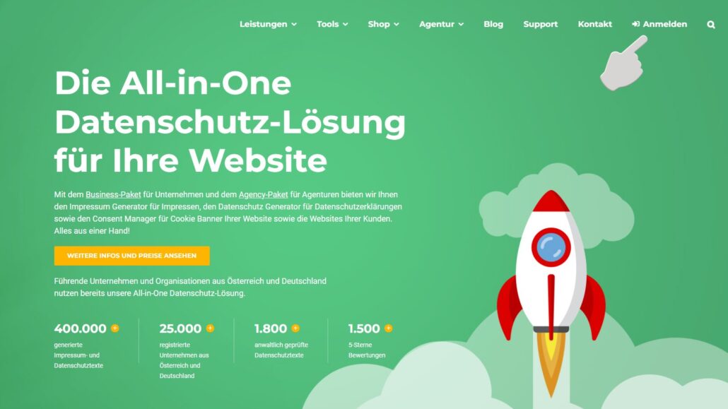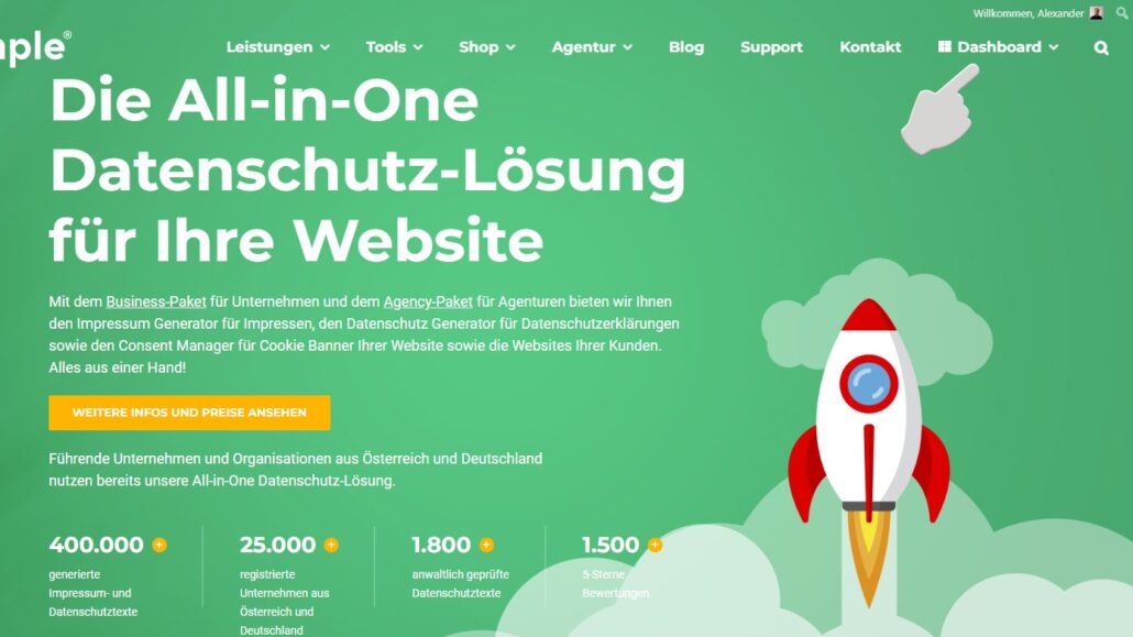 Sie befinden sich nun im Dashboard und sehen all unsere Tools. Klicken Sie nun auf Impressum & Datenschutz Manager.