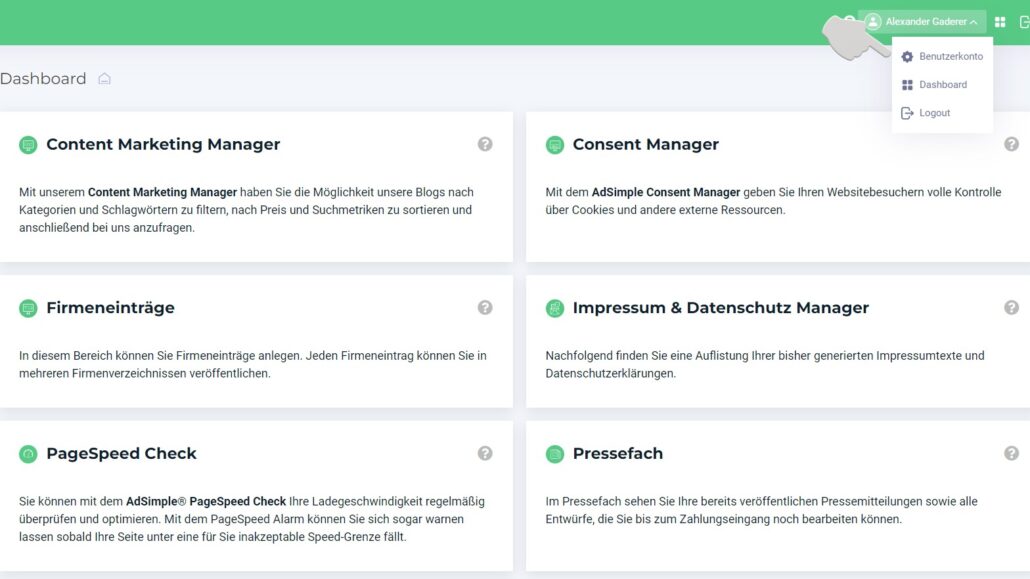 Sie befinden sich nun im Dashboard und sehen all unsere Tools. Am oberen rechten Bildschirmrand sehen Sie Ihren Namen. Klicken Sie auf den Namen und anschließend auf die Unterrubrik „Benutzerkonto”.