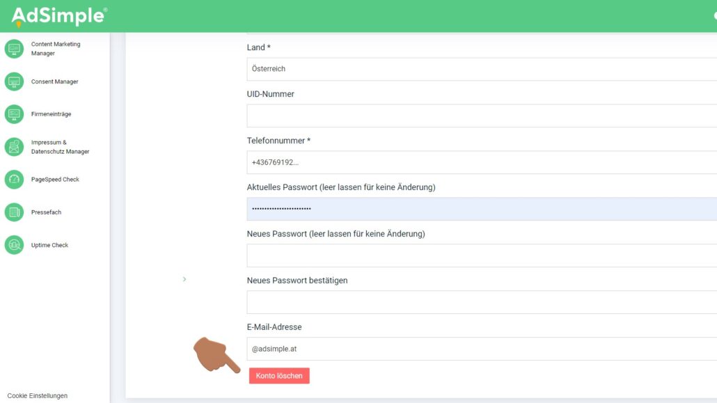 Scrollen Sie nun ganz nach unten. Dort finden Sie einen roten Konto-Löschen-Button. Klicken Sie auf diesen Button und bestätigen Sie die Löschung Ihres AdSimple-Kontos.