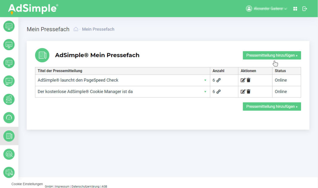 Wenn Sie sich auf adsimple.at mit Ihrem Benutzernamen anmelden oder sich neu registrieren, kommen Sie auf unser Dashboard. Dort sehen Sie all unserer Tools. Klicken Sie auf „Pressefach“ und schon kann es losgehen.