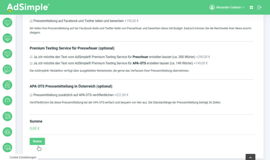 Nun können Sie zwischen verschiedenen Leistungen wählen: Sie können sich nur für die kostenlose Pressemitteilung, die Sie selbst verfassen entscheiden oder Sie nutzen unsere Zusatzangebote wie Social-Media-Boost, Premium Texting oder eine Veröffentlichung auf APA OTS. Nachdem Sie Ihre Wahl getroffen haben, klicken Sie auf den grünen “Weiter”-Button.