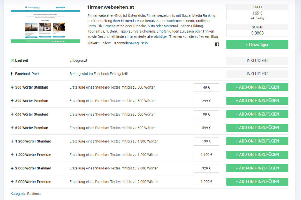- Unter der kurzen Beschreibung der ausgewählten Website können Sie bei Bedarf Texte oder Social Media Posts dazubuchen. Dafür klicken Sie einfach auf den „+ Add-on Hinzufügen“- Button. Rechts oben sehen Sie den Gesamtpreis Ihrer gebuchten Websites auf einen Blick.