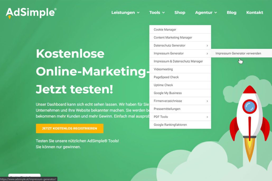Gehen Sie auf www.adsimple.at. Unter Tools finden Sie die Kategorie „Impressum Generator“. Klicken Sie dann auf die Unterkategorie „Impressum Generator verwenden“.
