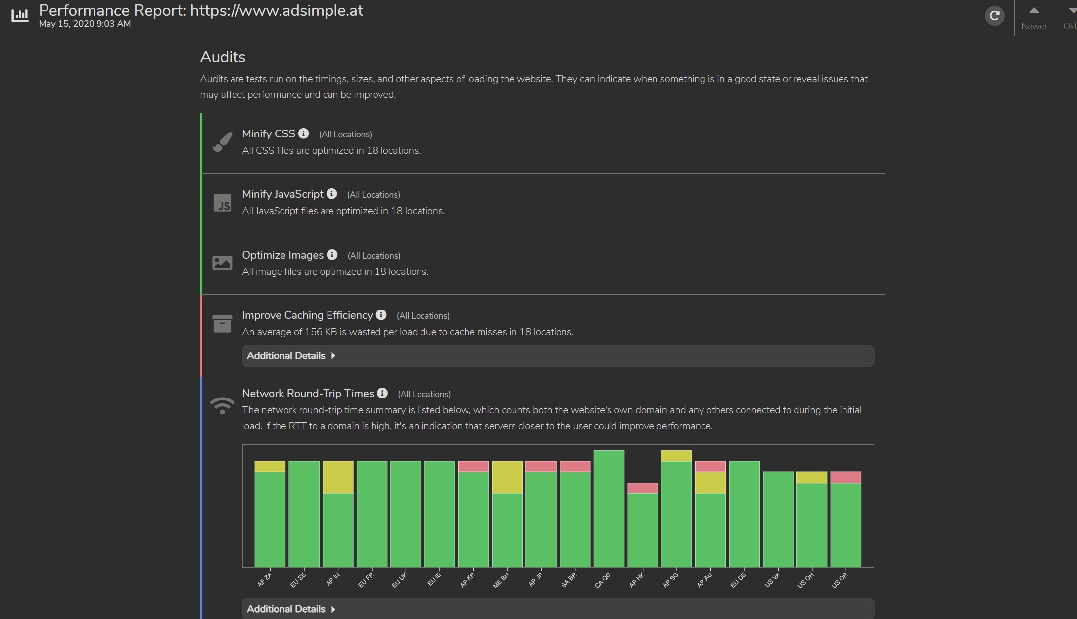 Alles in allem erhält man einen schönen Überblick wie schnell die eigene Website von verschiedenen Orten aus gesehen wird und was man tun könnte, um sie schneller zu machen. Dieses Service ist für Websites zu empfehlen, die weltweit Produkte und Dienstleistungen anbieten.