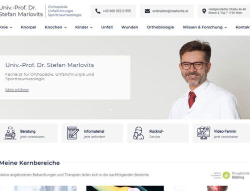 Unser Kunde Herr Univ.-Prof. Dr. Stefan Marlovits aus Wien kommt aus dem Medizinbereich und hat sich auf die Diagnostik und Behandlung von Knorpelschäden und Arthrose, individualisierter Knorpelchirurgie und Gelenkchirurgie spezialisiert. Speziell bei medizinischen Websites stehen die schnelle, einfache Navigation und ein hochwertiger, gut verständlicher Content im Vordergrund. Und genau auf diese Aspekte haben wir uns bei der Arbeit fokussiert. So schafften wir es, dass Patienten schnell und einfach genau jene Informationen finden, die sie brauchen.