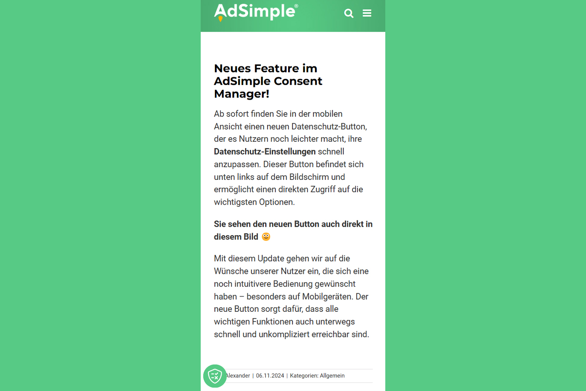 Neues Feature für den AdSimple Consent Manager: Ein stylischer Datenschutz-Button! Neues Feature für den AdSimple Consent Manager: Ein stylischer Datenschutz-Button! Von Alexander|13.11.2024|Kategorien: Tools|Tags: Consent Manager, Datenschutz-Einstellungen, Datenschutz-Feature| Weiterlesen