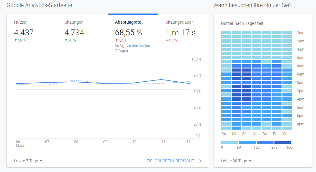 2) Bereits auf der Startseite sehen Sie neben den Faktoren Nutzer, Sitzungen und Sitzungsdauer auch die Absprungrate.