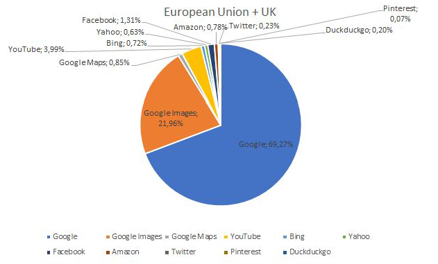 Die Daten stammen aus dem Zeitraum Jänner bis September 2018. Dadurch kann man einen einfachen Vergleich mit den US-Daten derselben Zeit ziehen. Die Zahlen betreffen 26 EU-Mitgliedstaaten (inkl. Großbritannien). Die Studie umfasst 252 Millionen Suchanfragen aus dem Datensatz des kleinsten Landes und 73 Milliarden aus dem größten Land (GB). In Europa hat Google noch mehr Marktanteil als in den USA. Die Monopolstellung ist aber auf beiden Kontinenten klar ersichtlich.  Alle “Google-Firmen” zusammengerechnet machen in den USA 93.4% aller Suchanfragen aus und in der EU (+ GB) sogar 96,1%.